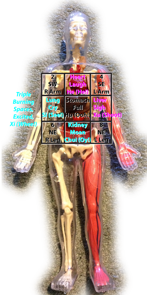 Make the internal sound and do the corresponding exercise the number of times indicated for that organ's position in the 9 Palaces Table.