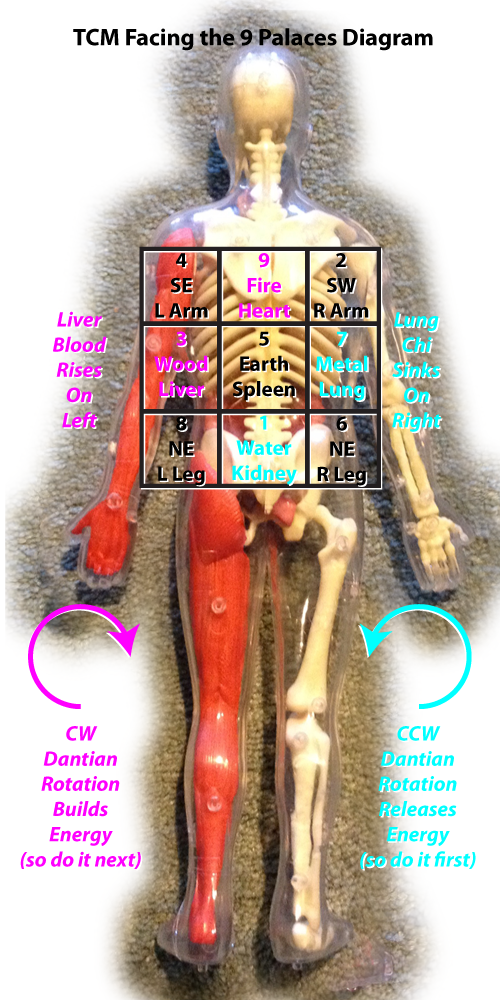 Therefore, Counterclockwise DanTian rotations starting from the Water location (below navel) break down or release energy since you are moving your internal energy with your hands against the 5 Element Creation Cycle: Water -> Metal (Lung) -> Fire (Heart) -> Wood (Liver) -> Water (Kidney or Bladder).