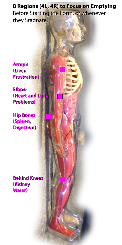 Energy stuck in these vessels (4 left, 4 right) cause health problems. Actively release them before and while doing the Tai Chi or QiGong forms. |