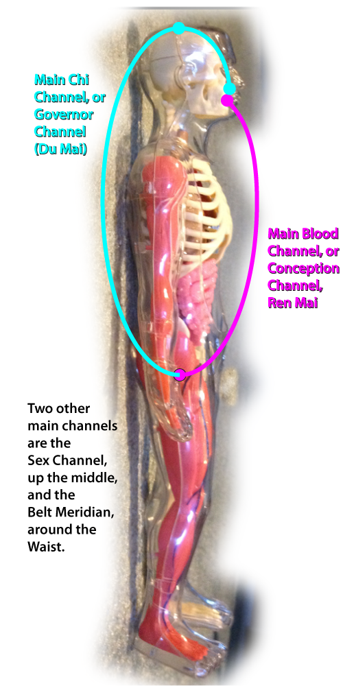 The Governor Meridian runs along the skin from the Perineum up the spine, over the head through the Most Yang Point, and down to the hard palate just behind the front teeth. The Conception Meridian runs from the Perineum along the front of the body to the tip of the tongue. When the tongue curls slightly at the tip and touches behind the front upper teeth, the circuit is completed and Qi and Blood flow well. When talking the circuit is broken. Hold a slight tension in the Perineum to keep the essences from "dripping out" the bottom of the loop. The Qi and Blood can circulate in either direction, and to force it to change in either direction is thought to be unnatural. This energy loop is called the Microcosmic Orbit, because Qi and Blood are thought to be like the Sun and Moon moving relative to the earth, and the Human Body is like a universe in miniature. This is why the 9 Palaces Map is also used for Feng Shui, enabling practitioners to adjust living spaces according to the same universal principles which govern the human body and its organs. |