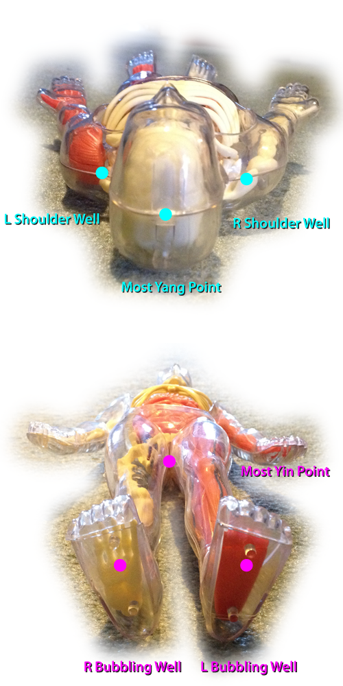 The Most Yin Point (Hui Yin, Perineum, the point between anus and genitals) is the starting and ending point for all energy in all QiGong exercises, says Professor Limin Qu. The Bubbling Well points are where the Human Essence begins to emerge from the Earth's energy. The Most Yang Point (Ba Gua, "Bah-Guey") is where 100 yang lines (all yang paths of the body) meet. There is another such point, at the big bone protruding at the vertebra at the base of the neck. The Shoulder Well points (where the Clavicle is felt between the shoulder muscles) on either side is the most important Health Maintenance Point in gigong. The basic exercise for "moving the stuck (tight) energy in the Shoulder Wells" is slow shoulder rotation exercise. On each side of the body, the Bubbling Well is where our Personal Energy starts, and the Shoulder Well is the peak of our Personal Energy. Professor Qu Limin says, "If you align the Bubbling Well Points with the Shoulder Well Points of both sides, and the Most Yin Point with the Most Yang Point while standing, this is better than doing the exercise form 100 times." |
